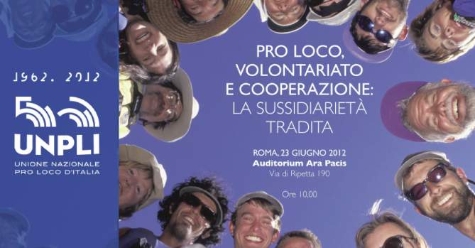 L’Unione Nazionale Pro Loco d’Italia, l’associazione che riunisce oltre seimila Pro Loco sparse su tutto il territorio nazionale con oltre 600mila soci, festeggia 50 anni di attività. Il programma dei festeggiamenti, fa tappa a Roma presso l’Auditorium dell’Ara Pacis in Via di Ripetta dove si terrà il convegno "Pro Loco, volontariato e cooperazione: la sussidiarietà tradita".