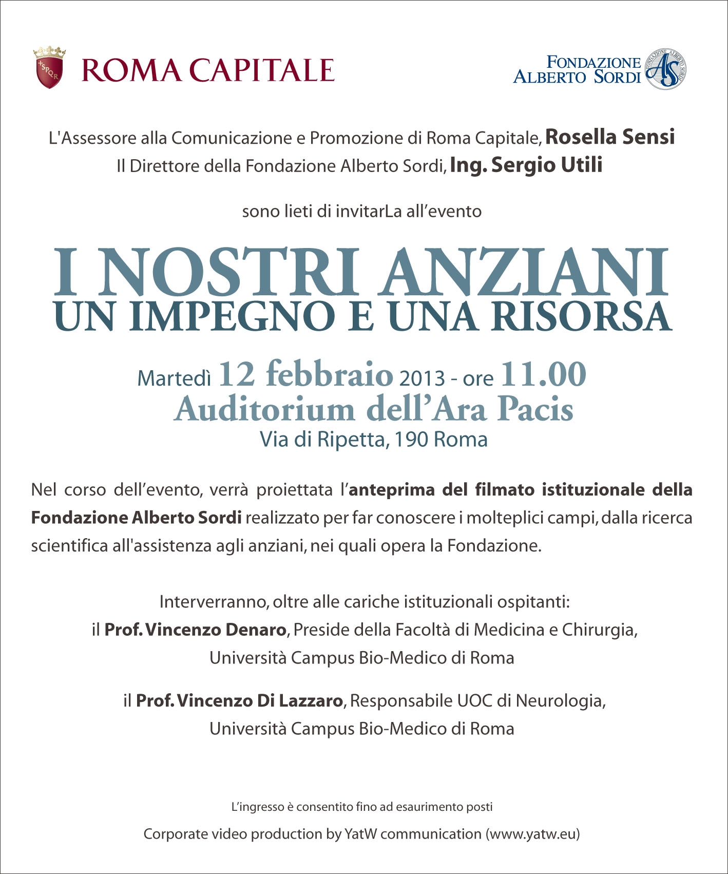 In occasione delle celebrazioni per il decennale della morte di Sordi, martedì 12 febbraio alle ore 11 presso l’Auditorium dell’Ara Pacis, la Fondazione Alberto Sordi presenta in anteprima il filmato istituzionale realizzato per far conoscere i molteplici campi, dalla ricerca scientifica all’assistenza agli anziani, nei quali opera. Alla presentazione interverranno: Rosella Sensi Assessore alla Comunicazione e Promozione di Roma Capitale, Sergio Utili Direttore della Fondazione Alberto Sordi, Vincenzo Denaro Preside della Facoltà di Medicicna e Chirurgia, Università Campus Bio-Medico di Roma, Vincenzo Di Lazzaro Responsabile UOC di Neurologia, Università Campus Bio-Medico di Roma.
