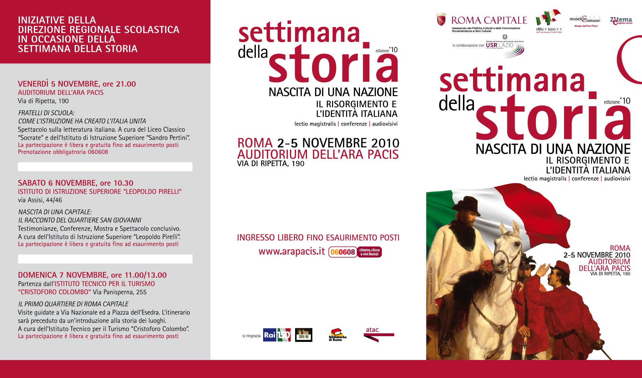 Sarà la Settimana della Storia, nella prestigiosa sede dell’Ara Pacis di Augusto, ad aprire il calendario delle manifestazioni in onore dei 150 anni dell’Unità d’Italia a Roma. Illustri storici italiani insieme con giornalisti e saggisti si confrontano sui temi fondamentali della nascita della nostra identità e cultura nazionale.